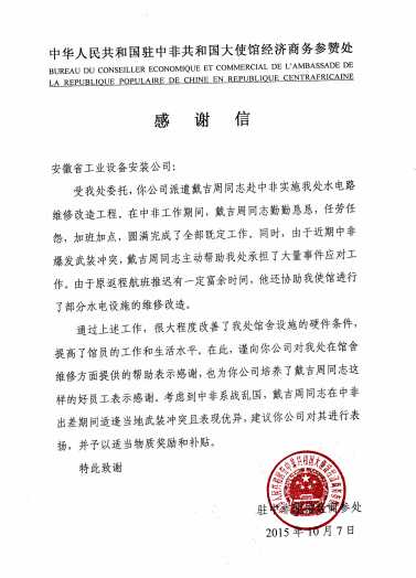 近日,公司收到中華人民共和國(guó)駐中非共和國(guó)大使館經(jīng)濟(jì)商務(wù)參贊處發(fā)來的感謝信,信中對(duì)我公司戴吉周同志在駐中非使館經(jīng)商參處水電路維修改造工程中的優(yōu)異工作表現(xiàn)表示衷心感謝。