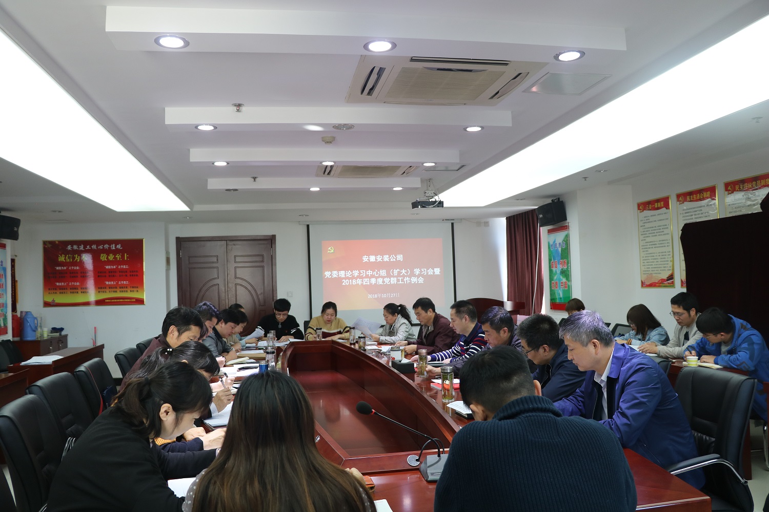 10月27日上午,安徽安裝公司召開2018年四季度黨群工作例會。會議由公司黨委書記、董事長胡六中主持。所屬各基層黨支部、工會、團支部主要負責同志及公司黨群部門人員參加了會議。