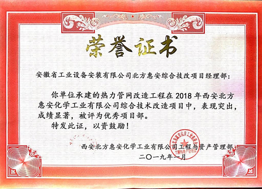 近日,安徽安裝承建的西安北方惠安化學(xué)工業(yè)有限公司綜合技改項(xiàng)目熱力管網(wǎng)改造工程,經(jīng)項(xiàng)目部全體人員共同努力,保質(zhì)保量地完成了業(yè)主的節(jié)點(diǎn)目標(biāo),贏得了業(yè)主高度認(rèn)可和好評(píng),被業(yè)主授予“優(yōu)秀項(xiàng)目部”榮譽(yù)稱號(hào),成為各參建單位的標(biāo)桿,業(yè)主特別頒發(fā)了榮譽(yù)證書和感謝信感謝項(xiàng)目全體人員所作出的貢獻(xiàn),