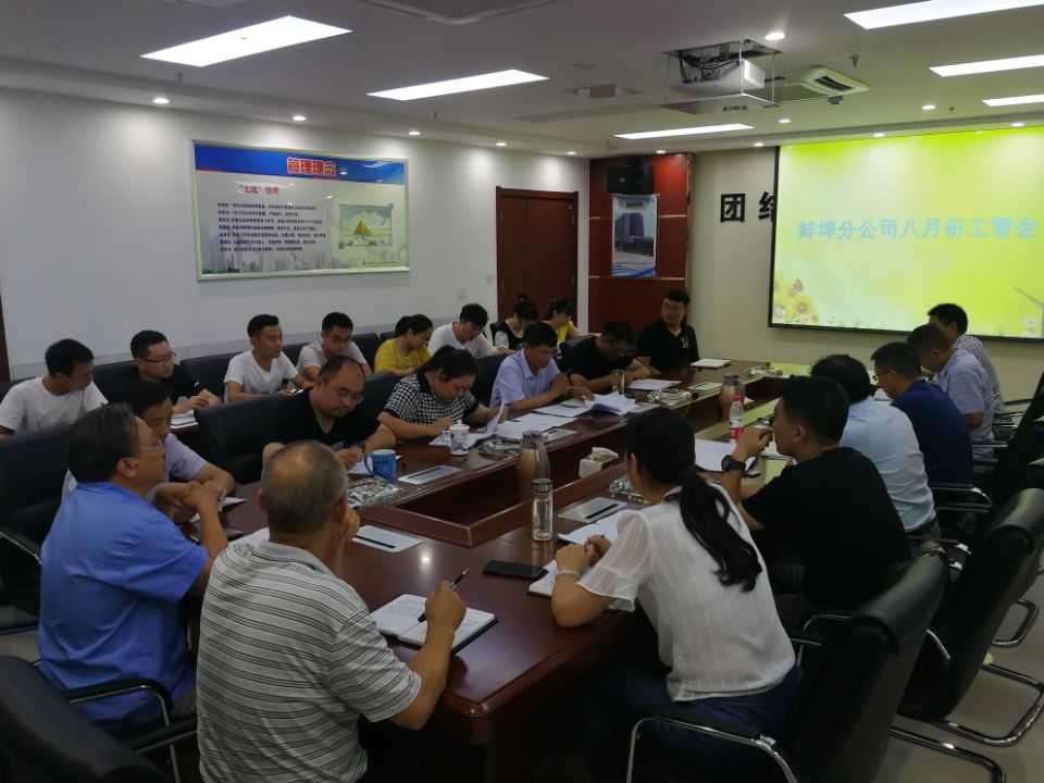 2019年7月31日下午,蚌埠分公司召開八月份份工程管理會議。公司副總經理高飛攜工程管理部相關人員荏臨指導工作。分公司領導班子成員、分公司機關各部門負責人及各項目經理參加了會議,會議由分公司副經理張漢軍主持。
