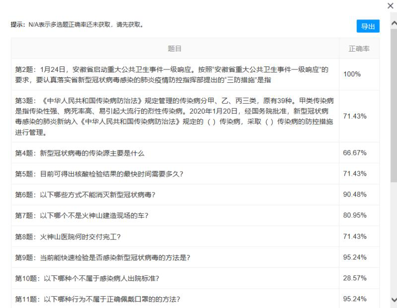 本次疫情防控知識答題通過在分公司微信群發(fā)送答題鏈接開展,內(nèi)容涵蓋新冠肺炎基本知識、疫情防控措施、員工居家防控等多項(xiàng)內(nèi)容,同時(shí)還對上級在疫情期間下發(fā)的各類疫情防控工作指導(dǎo)意見、措施等進(jìn)行了宣貫。此次活動,員工參與率達(dá)到了100%,不僅加強(qiáng)了員工對防疫知識的了解,還提高了預(yù)防疾病自我保護(hù)的意識,防疫知識掌握情況總體較好。通過參與答題,廣大員工進(jìn)一步了解了新冠肺炎的傳播途徑及相關(guān)防護(hù)措施,表示要努力做到認(rèn)真理性對待疫情,保持良好個人生活習(xí)慣和公共衛(wèi)生習(xí)慣,遵守疫情防控工作要求,胸懷全局、統(tǒng)一思想,堅(jiān)決打贏疫情防控阻擊戰(zhàn)。