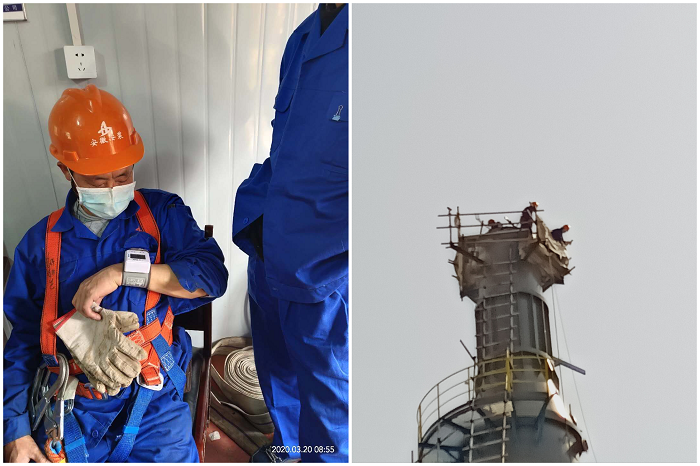 面對Ⅲ級高空作業(yè),項目部從對登塔作業(yè)人員的篩選開始就不敢有半點大意,除了項目技術負責人、安全負責人分別進行技術和安全交底外,還仔細檢查了登塔人員體檢報告,并在登塔作業(yè)前逐一對其進行血壓測量,確保高處作業(yè)人員身體狀況穩(wěn)定。同時,配備對講機,保障上下作業(yè)人員密切配合,順利吊裝,還要對作業(yè)平臺和周圍區(qū)域滿鋪防火布,設置接火盆,避免塔體下方易燃易爆風險,以此杜微慎防,確保萬無一失。11時28分,脫硫塔上段吊裝正式開始。在場人員個個屏息凝神,目光隨著脫硫塔一起移動,思緒跟著脫硫塔一起飆高,“慢慢的...升一點...往西偏一點點...好!停!...降,慢一點...降降降,好!”終于完成上段吊裝環(huán)節(jié)作業(yè),所有人懸著的心都放下來了,但是任務還沒徹底完成,接下來就是更重要的對口、焊接環(huán)節(jié)。由于要進入塔內進行對口焊接,為了保障作業(yè)人員的生命安全,配備氣體檢測儀,以測量塔內氧氣濃度是否正常,無硫化氫和可燃性氣體是否超標。