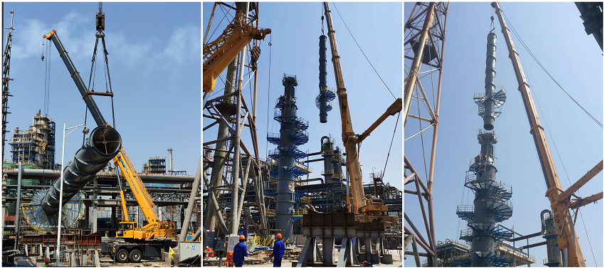此次吊裝的脫硫塔上段,高28米,直徑1.8米, 含平臺、梯子總重28噸。吊裝荷載雖不及脫硫塔下段,但由于是在33米的高空與下段進行組對,不像在地面那般“接地氣”,晃動造成組對難度增大,而且涉及到高處動火和受限空間作業(yè),對工人的心理素質和技藝水平要求十分嚴苛。加之作業(yè)區(qū)域毗鄰易燃易爆物硫化氫和瓦斯管線,風險系數(shù)異常大,作業(yè)難度絲毫不亞于脫硫塔下段安裝。對此,項目部在脫硫塔下段成功吊裝的經驗基礎上,充分分析技術難點、風險隱患,制定針對性吊裝方案及防護措施,按照方案要求采用額定荷載500噸的汽車吊主吊,50噸的汽車吊溜索配合作業(yè)。