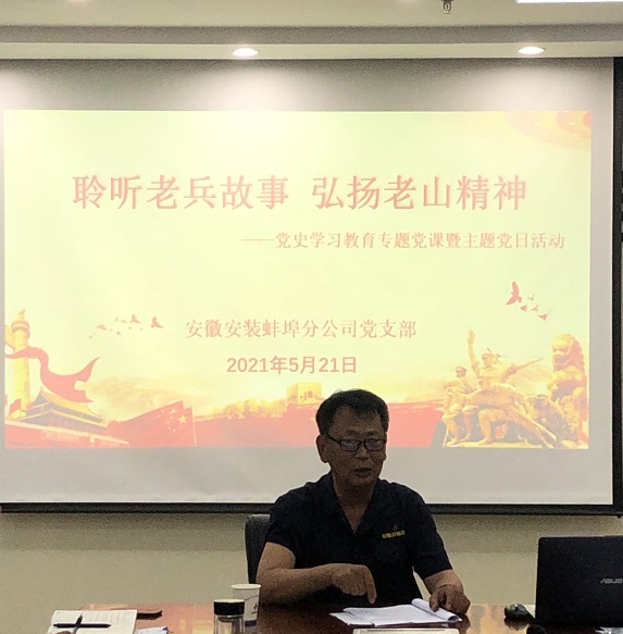 為深入開展黨史學(xué)習(xí)教育活動,進一步引導(dǎo)黨員干部學(xué)習(xí)黨史、銘記黨史,5月21日下午,蚌埠分公司黨支部組織開展了一場“聆聽老兵故事 弘揚老山精神”黨史學(xué)習(xí)教育專題黨課暨主題黨日活動。邀請曾參加過對越自衛(wèi)反擊戰(zhàn)的退伍老兵,分公司在職員工年飛同志為大家上了一堂別開生面的黨課。分公司班子成員、項目經(jīng)理、部門負責(zé)人及全體黨員參會。