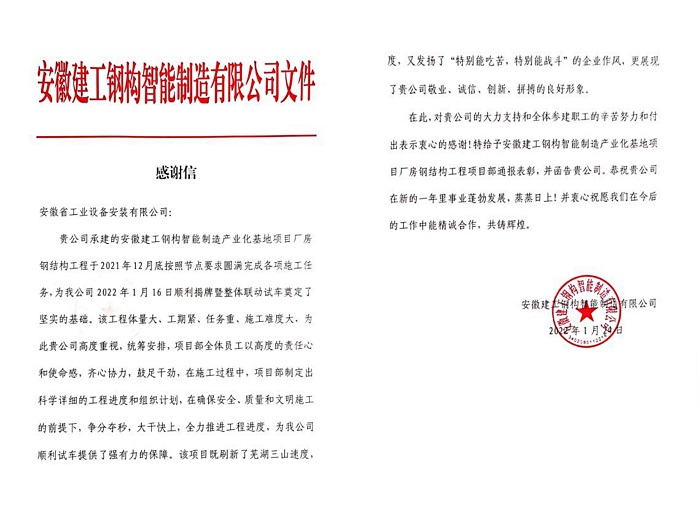 近日,公司安徽建工鋼構(gòu)智能制造有限公司廠房鋼結(jié)構(gòu)工程項目收到業(yè)主單位安徽建工鋼構(gòu)智能制造有限公司感謝信,信中對建工鋼構(gòu)廠房鋼結(jié)構(gòu)工程項目部在工程施工中的辛苦努力和突出表現(xiàn)表達(dá)了高度贊譽和衷心感謝!
