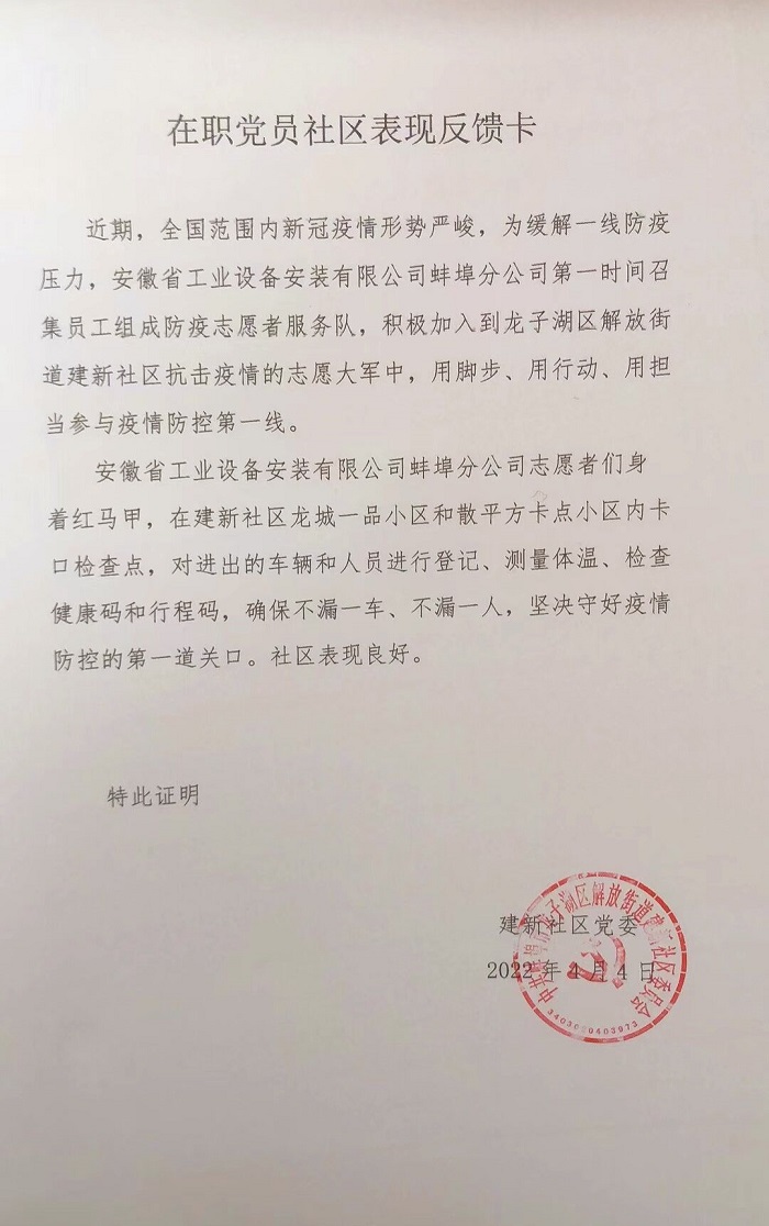 通過本次活動,志愿者們用實際行動踐行了初心和使命,展現(xiàn)了安徽安裝志愿者飽滿的精神風(fēng)貌。建新社區(qū)黨委表達(dá)了對于安徽安裝公司的真誠感謝,期間社區(qū)及時通過微信公眾號對安徽安裝積極擔(dān)當(dāng)社會責(zé)任予以報道,有效擴大了企業(yè)影響力,樹立了良好企業(yè)形象。