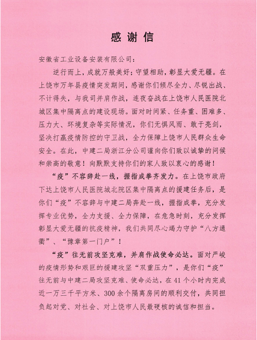 信中對(duì)安徽安裝公司與中建二局浙江分公司共同援建上饒市人民醫(yī)院北城區(qū)集中隔離點(diǎn)給予高度的肯定和認(rèn)可。當(dāng)前,新冠疫情形勢(shì)嚴(yán)峻,安徽安裝公司在嚴(yán)格落實(shí)屬地疫情防控措施的同時(shí),一方面積極參與本地區(qū)隔離點(diǎn)、醫(yī)院發(fā)熱門診的緊急建設(shè)任務(wù);另一方面攜手相關(guān)行業(yè)兄弟單位同心協(xié)力、援建市外防疫區(qū)域,承擔(dān)起國(guó)有企業(yè)社會(huì)責(zé)任,竭盡所能地為防疫建設(shè)貢獻(xiàn)最大的力量!