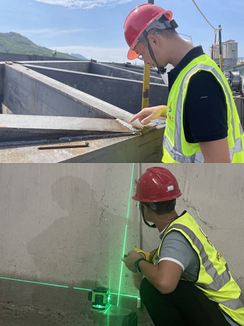 圖為岳西恒太城項目穹頂鋼結構檢查及影廳看臺放線場景
