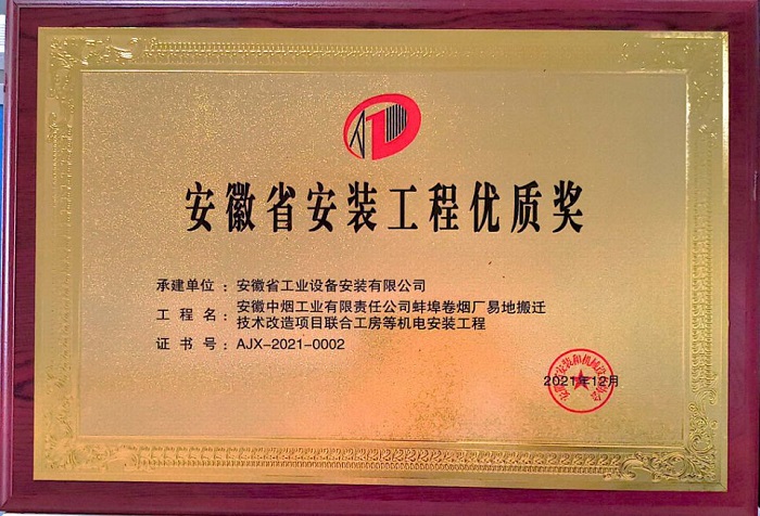 近日,安徽省安裝和機械設備協(xié)會第八屆會員代表大會在合肥順利召開,會議頒發(fā)了“2021-2022年安徽省安裝工程優(yōu)質獎”,我單位承建的安徽省中煙工業(yè)有限責任公司蚌埠卷煙廠易地搬遷技術改造項目聯(lián)合工房等機電安裝工程、康寧藥用硼硅玻璃管廠房設施建設工程(安裝工程)分別榮獲2021年度“安徽省安裝工程優(yōu)質獎”、2022年度“安徽省安裝工程優(yōu)質獎”榮譽稱號。