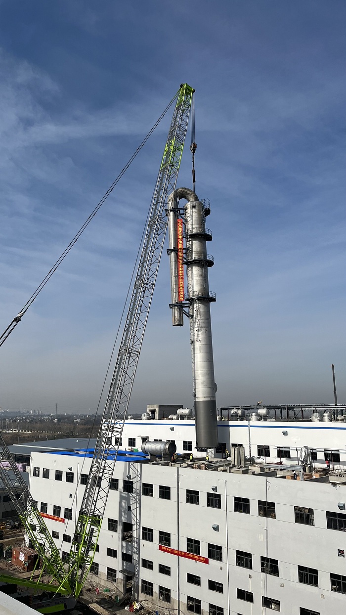 12月20日上午,安徽安裝合肥分公司承攬的蕪湖普立思生物科技有限公司聚乳酸及公用工程安裝項目丙交酯車間精餾塔一次性吊裝成功。
