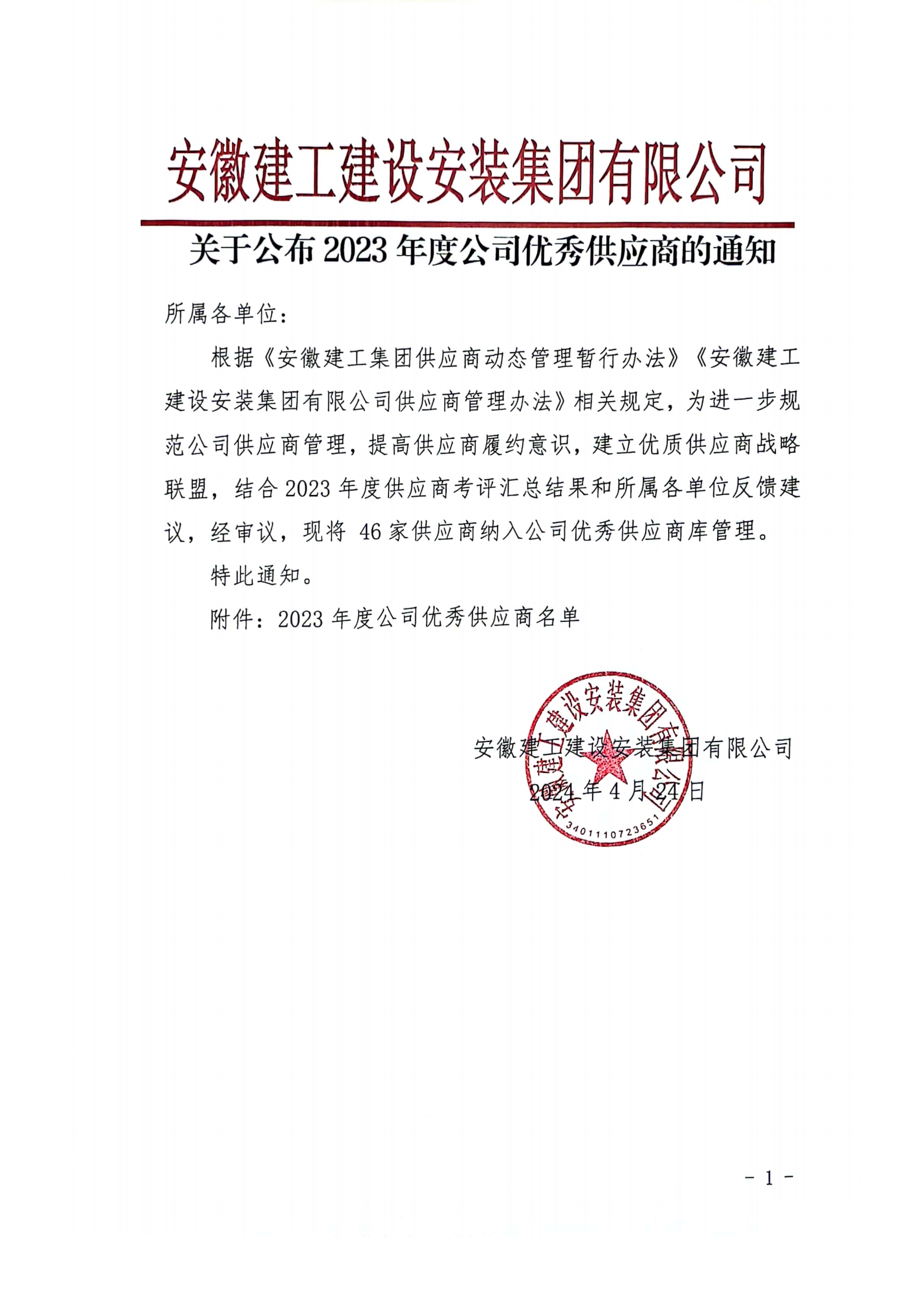 關于公布2023年度公司優(yōu)秀供應商的通知