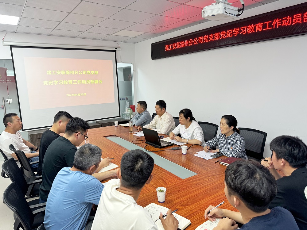 4月25日下午,建工安裝滁州分公司黨支部召開黨紀(jì)學(xué)習(xí)教育動(dòng)員部署會(huì)。學(xué)習(xí)貫徹習(xí)近平總書記關(guān)于全面加強(qiáng)黨的紀(jì)律建設(shè)的重要論述,傳達(dá)學(xué)習(xí)黨中央關(guān)于黨紀(jì)學(xué)習(xí)教育的決策部署和集團(tuán)公司及公司黨委相關(guān)工作要求。分公司領(lǐng)導(dǎo)班子成員、全體黨員、部分機(jī)關(guān)部門負(fù)責(zé)人等參加會(huì)議。