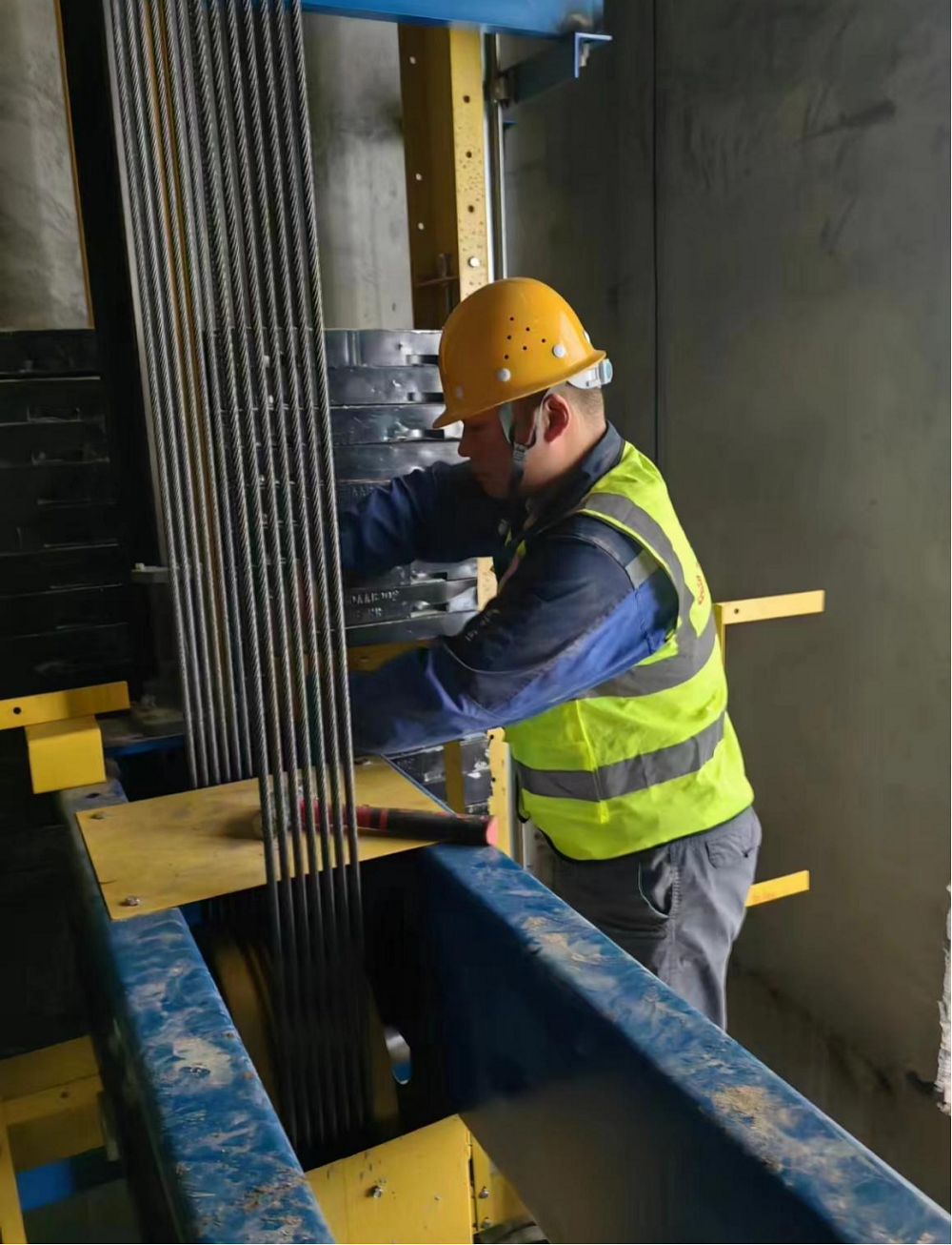 蚌埠高新區(qū)電子信息產(chǎn)業(yè)園電梯安裝項(xiàng)目現(xiàn)場(chǎng)安裝人員正在井下進(jìn)行電梯安裝