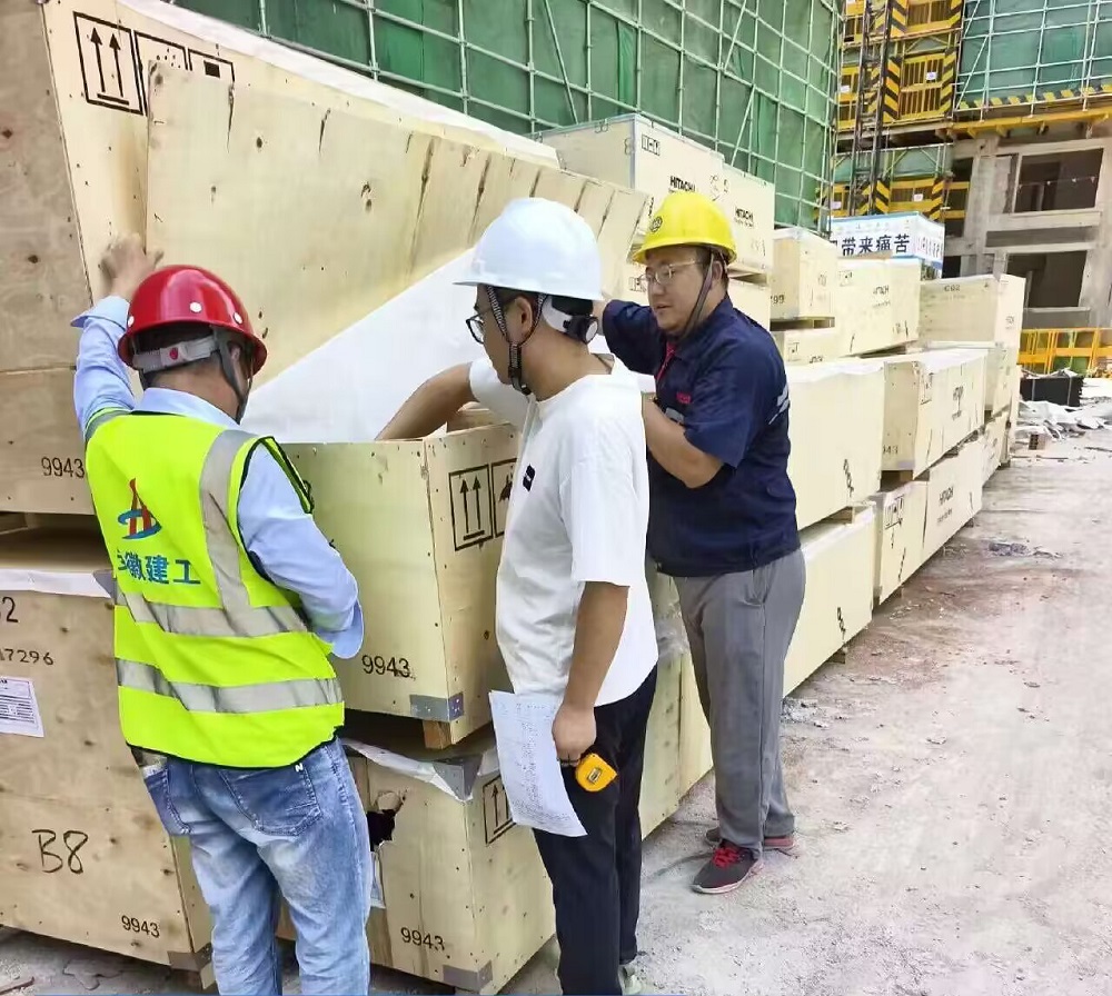 現(xiàn)場人員正在進行到貨電梯檢查
