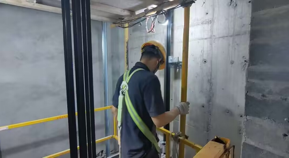 現(xiàn)場施工人員正在轎頂進行安裝
