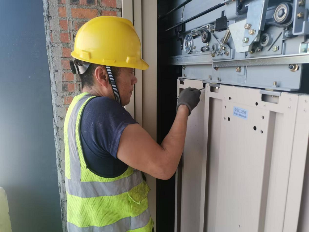 蚌埠傳感谷(寧波蚌埠微電子產(chǎn)業(yè)園一期)項(xiàng)目施工人員正在安裝電梯轎廂門