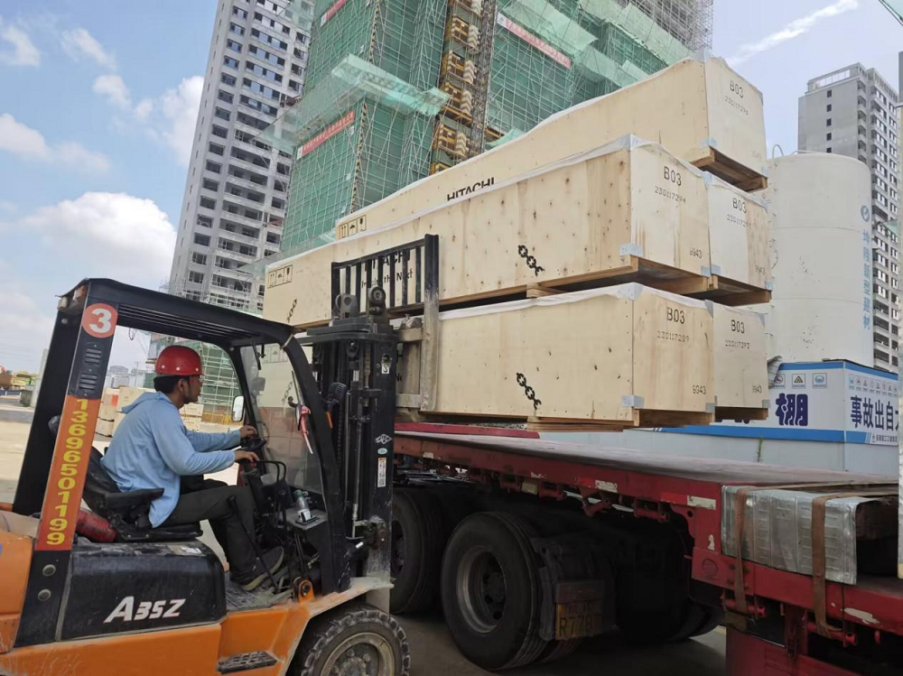 派河印象·杏語(yǔ)林溪項(xiàng)目施工人員正在給到場(chǎng)電梯卸貨