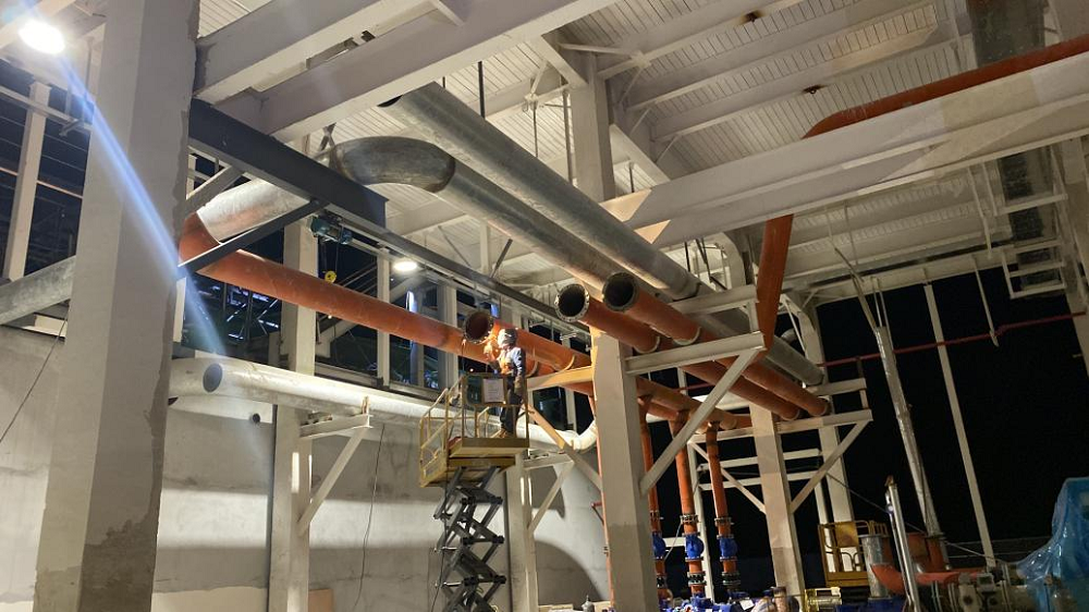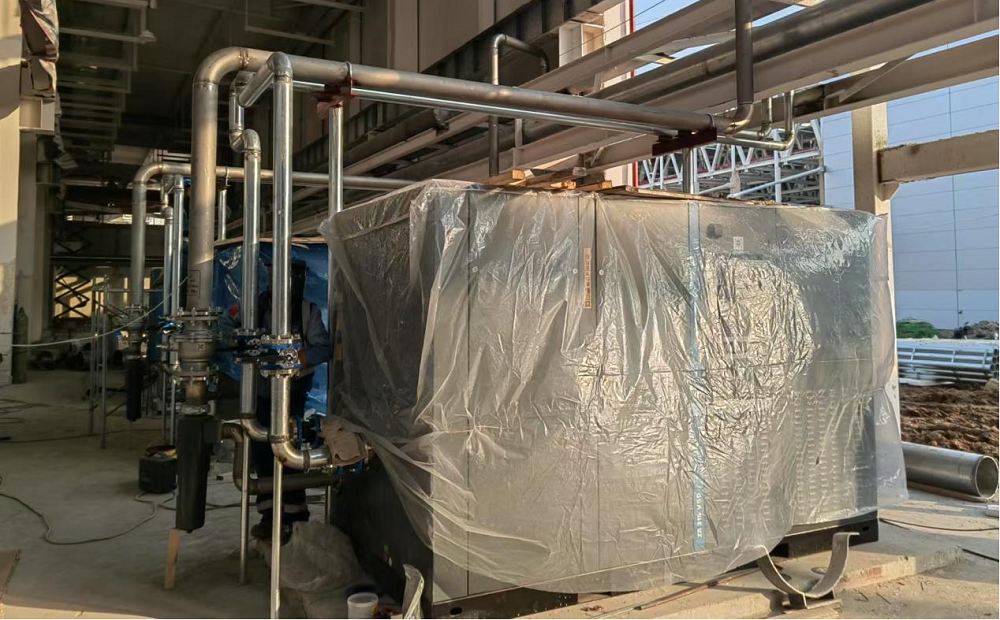 站房一(能源中心)作為整個(gè)廠區(qū)的“發(fā)動(dòng)機(jī)”,建筑面積雖僅有11000平方米,但單體機(jī)電安裝造價(jià)約8000萬元,施工內(nèi)容涵蓋空壓站、污水處理站、高效制冷機(jī)房、消防泵房及給水加壓站房等全廠幾乎所有核心“部件”。面對(duì)施工工藝復(fù)雜、工期緊、標(biāo)準(zhǔn)高且施工過程中設(shè)計(jì)變更頻繁、設(shè)備供貨周期長、資金不到位等多種不利因素,項(xiàng)目部積極想辦法克服困難,采取主動(dòng)對(duì)接各方資源,深化設(shè)計(jì)確認(rèn)、督促設(shè)備批量排產(chǎn)、加快技術(shù)交底完成、倒排施工計(jì)劃等一系列有效措施,堅(jiān)持“搶進(jìn)度、抓質(zhì)量、保安全”核心思想不動(dòng)搖,加班加點(diǎn)推進(jìn)項(xiàng)目建設(shè)。截至目前,站房一(能源中心)形象進(jìn)度已完成55%以上,實(shí)現(xiàn)產(chǎn)能過半,為確保關(guān)鍵合同節(jié)點(diǎn)“2025年2月28日公用動(dòng)力系統(tǒng)調(diào)試完成,并具備各生產(chǎn)條件”打下堅(jiān)實(shí)基礎(chǔ)。